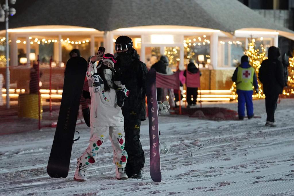 图为夜滑的雪友们在万科松花湖滑雪度假区内拍照留念。新华社记者司晓帅 摄