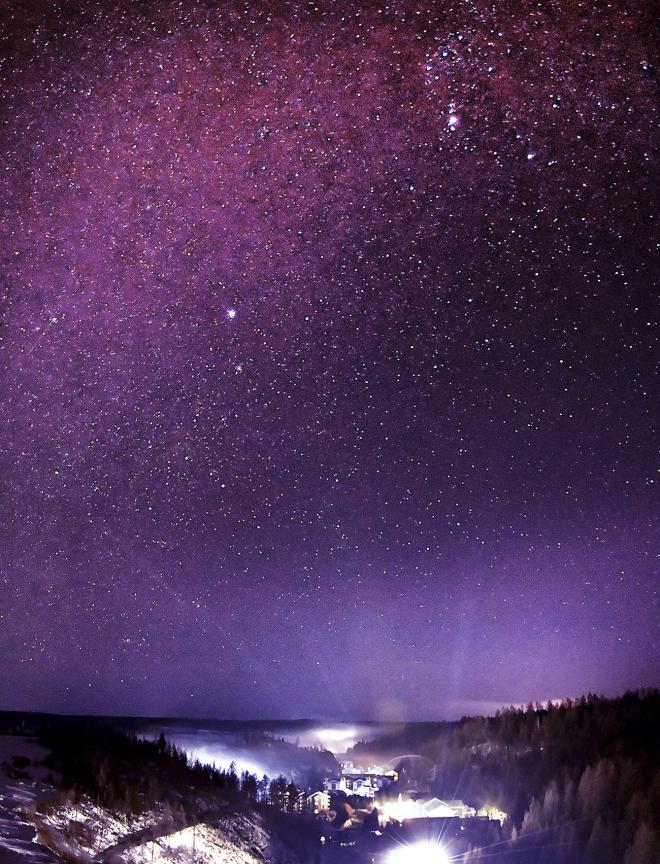 以特别的自然景致而著称的朝鲜北部白头山地区鲤明水沟夜空中星河耿耿,展现一片壮观。