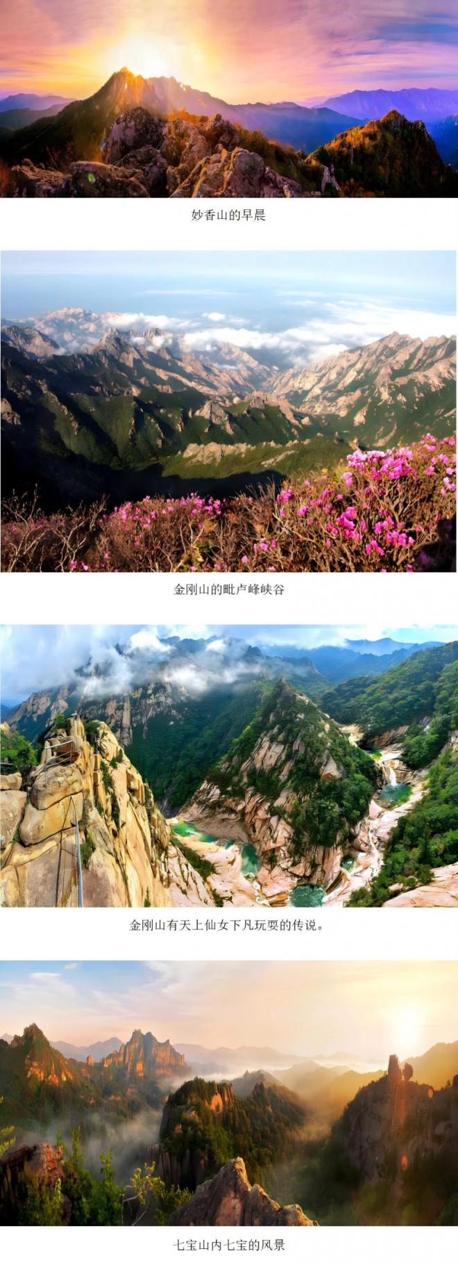 妙香山是奇妙和雄伟相协调的名山,金刚山则是集山岳美、溪谷美、高原风景、远景、湖景、海景和岸景为一体的名胜。