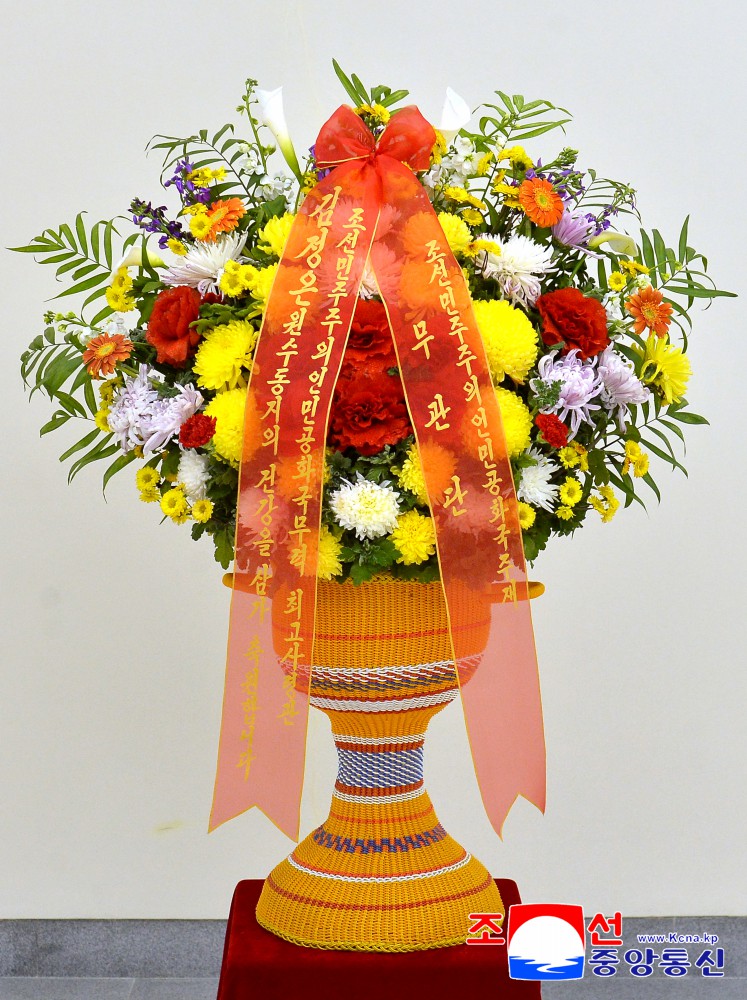 花篮缎带上写有“谨祝朝鲜民主主义人民共和国武装力量最高司令官金正恩元帅同志健康”的字样。